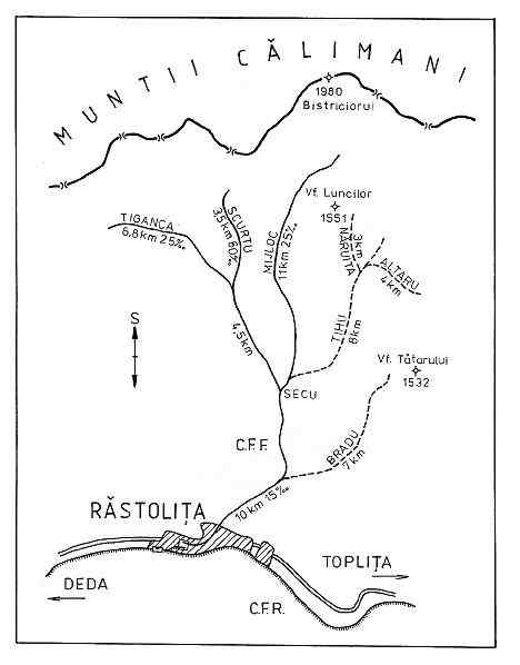 V roce 1988 jsme se vypravili do Rumunska poznat provoz na několika lesních železnicích. Inspirací pro nás bylo několik článků, které uveřejnil časopis Železničář a zkušenosti kolegů, kteří již rumunské lesní železnice navštívili. Rastolita leží mezi stanicemi Deda a Toplita severozápadně od Brašova. Výchozím bodem úzkorozchodné lesní železnice do pohoří Caliman je pila u železniční stanice CFR. Do areálu pily vede ze stanice CFR normálněrozchodná vlečka. Údolí říčky Mures je ráno ponořeno do mlhy, kterou ještě umocňuje dým z parní lokomotivy CFF 764.437. Je půl sedmé. Schází se první dělníci. Od strojvedoucího se dovídáme, že vláček vyjede asi v 7.00 hodin. Lokomotiva posunuje v areálu pily a sestavuje vlak. Za řadou prázdných oplenových vozů je vůz vrchovatě naložený senem a několik gravitačních drezín. Na jednu drezínu ukládáme krosny a usedáme po vzoru ostatních. Hvizd parní píšťaly a souprava se dává do pohybu. Projíždíme osadou Rastolita, která se rozkládá na obou březích říčky Mures. Tuto nevelkou vodní překážku úzkorozchodka překonává po ocelovém příhradovém mostě. Vjíždíme do údolí říčky Rastolita. Ranní mlha ustupuje, čeká nás pěkný letní den. Kromě trati vede údolím také prašná cesta. Lokomotiva hravě zdolává stoupání 15 promile a po 10 km jízdy zastavuje na odbočce Secu. Zde odbočuje trať do doliny Mijloc. Jsme uprostřed smrkových lesů. Po doplnění zásob vody a písku se vlak dává do pohybu. Po 4,5 km jízdy zastavujeme na další odbočce. Zde odvěšují vůz ze senem a vlak se opět rozjíždí. Jeho cílem je 3,5 km vzdálené nákladiště v dolině Scurtu. Po počátečním rozjezdu lokomotiva ztrácí rychlost. Stoupá metr po metru. Vjíždíme do překrásného horského údolí. Kromě dvou pásů kolejnic vzdálených od sebe 760 mm zde bublá potůček. Dráha překonává táhlé stoupání téměř 60 promile. Jsou chvíle, kdy je na plíživém pohybu vlaku znát každý zdvih pístu parního stroje. Všude je plno páry – lokomotiva není právě v nejlepším technickém stavu. Konečně dosahujeme stanice Scurtu. Jsme asi 2 km od odbočky, ale výškový rozdíl, který vlak překonal, je úctyhodný. Lokomotiva zastavuje, aby dobrala vodu. Následuje krátký posun pomocí lana a vlak pokračuje až k nákladišti pod hlavním hřebenem pohoří. Dolů sjíždí samospádem několik vozů ložených kulatinou. Jsou brzděny dvěma brzdaři, kteří k jízdě musí mít notný kus odvahy. Plni zážitků scházíme po trati k odbočce Secu. Zde se dovídáme údaje o síti zdejší úzkorozchodky. Hlavní trať byla postavena v roce 1928. Podle podmínek k těžbě dřeva se buď dostavovaly nebo rušily odbočky. V letech 1970-72 byl zrušen pro sesuv půdy úsek podél řeky Tihu. Přepravu dřeva z této doliny obstarávají nákladní automobily. V letech 1976-78 byla zrušena 7 km dlouhá odbočka údolím Brad z důvodu vytěžení dřeva v této oblasti. V létě 1988 provoz zajišťovaly dvě lokomotivy CFF 764.467 (Resita 1207/1956) a 764.437 (Resita 1142/1954). Neprovozní zde byl stroj 764.320 (Budapešť 5281/1942). Dřevo se přepravovalo na oplenových vozech. Při větší očekávané přepravě osob byl do vlaku zařazen osobní vůz. Prakticky vždy byla na konci vlaku zařazena gravitační drezína. Provoz na lesní železnici v Rastolitě, stejně jako na většině ostatních lesních železnicích CFF, byl již před lety zrušen. Skončila tak možnost zažít romantiku parní lesní železnice v hlubokých údolích pohoří Caliman.